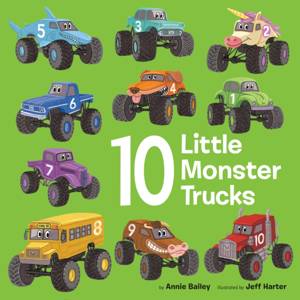 Fans of monster trucks can count down from ten to one as they follow ten different crunching, munching, roaring trucks! Ten little monster trucks gear...Lees meer