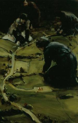 Elf vrouwen zitten op hun knieën in een miniatuurlandschap. Of zijn het reuzinnen? Wat ze precies doen is onduidelijk. Een schilderij van bescheiden a...Lees meer