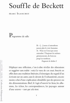 Souffle de Beckett Écrit en 1969, Souffle est une pièce de 35 secondes présentée comme un intermède. D'une brièveté absolue, dans l'oeuvre de Beckett ...Lees meer