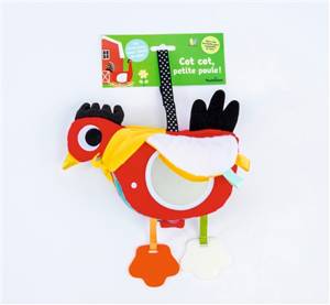Un livre en tissu en forme de grenouille proposant des activités sensorielles : une comptine, du papier crissant, un grelot, un miroir et deux anneaux...Lees meer
