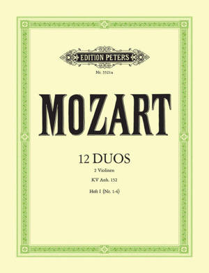 12 duos for two violins, KV Anh. 152, Volume 1 (No. 1-4). These 12 pieces are transcriptions for violin duet of works by Wolfgang Amadeus Mozart, orig...Lees meer