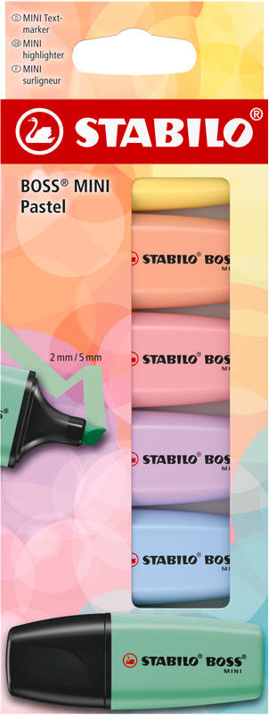 STABILO BOSS MINI Pastel - mini-markeerstift. Voor alle creatievelingen en zij die van pastelkleuren houden. Door zijn mini formaat, past hij perfect ...Lees meer