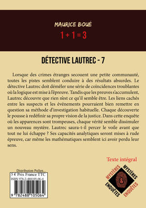 Lorsque des crimes étranges secouent une petite communauté,toutes les pistes semblent conduire à des résultats absurdes. Le détectiveLautrec doit démêler une série de coïncidences troublantes où la logique estmise à l’épreuve. Tandis que les preuves s’accumulent, Lautrec découvre que rienn’est ce qu’il semble être. Les liens cachés entre les suspects et lesévénements pourraient bien remettre en question sa méthode d’investigationhabituelle. Chaque découverte le pousse à redéfinir sa propre vision de lajustice. Dans cette enquête où les apparences sont trompeuses, chaque véritésemble dissimuler un nouveau mystère. Lautrec saura-t-il percer le voile avantque tout ne lui échappe ? Ses capacités analytiques seront mises à rude épreuve,car même les mathématiques semblent ici avoir perdu leur sens.
