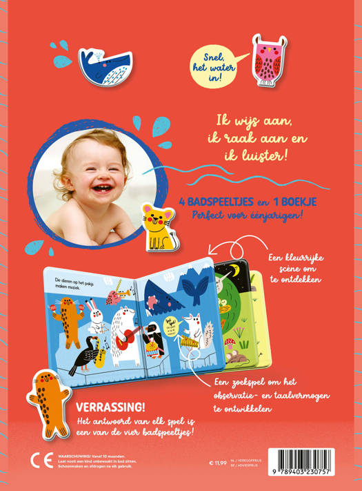 In dit stevige kartonnen zakjes zit een badboekje voor kindjes vanaf 1 jaar en vier losse badspeeltjes om aan het bad of de douche te kleven. Op elke pagina van het boekje staat een zoek- of doevraag. De badspeeltjes werken met een zuignapfunctie en kun je hergebruiken. Dankzij de tekenstijl met contrasterende kleuren en dikke lijnen kan baby goed meekijken. Met dit badboekje wordt in bad gaan reuzeleuk!