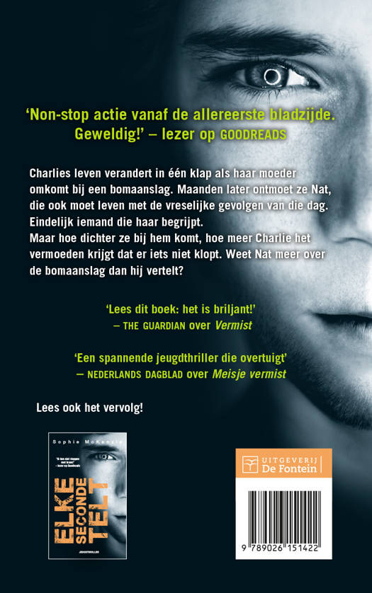 1 seconde is een razend spannende jeugdthriller van Sophie McKenzie, die met haar debuut Vermist bijna elke juryprijs in Engeland won. Voor jongeren vanaf 13 jaar. Met politie niet betreden-elastiek.