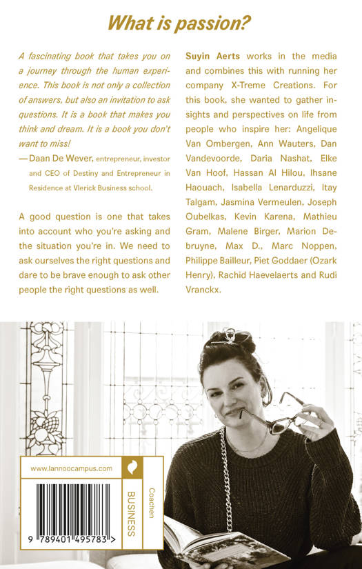 Suyin Aerts works in the media and combines this with running her company X-Treme Creations. For this book, she wanted to gather insights and perspectives on life from people who inspire her: Angelique Van Ombergen, Ann Wauters, Dan Vandevoorde, Daria Nashat, Elke Van Hoof, Hassan Al Hilou, Ihsane Haouach, Isabella Lenarduzzi, Itay Talgam, Jasmina Vermeulen, Joseph Oubelkas, Kevin Karena, Mathieu Gram, Malene Birger, Marion Debruyne, Max D., Marc Noppen, Philippe Bailleur, Piet Goddaer (Ozark Henry), Rachid Haevelaerts and Rudi Vranckx.