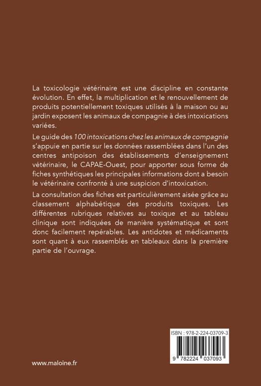 Le guide des 100 intoxications chez les animaux de compagnie s’appuie en partie sur les données rassemblées dans l’un des centres antipoison des établissements d’enseignement vétérinaire, le CAPAE-Ouest, pour apporter sous forme de fiches synthétiques les principales informations dont a besoin le vétérinaire confronté à une suspicion d’intoxication.
