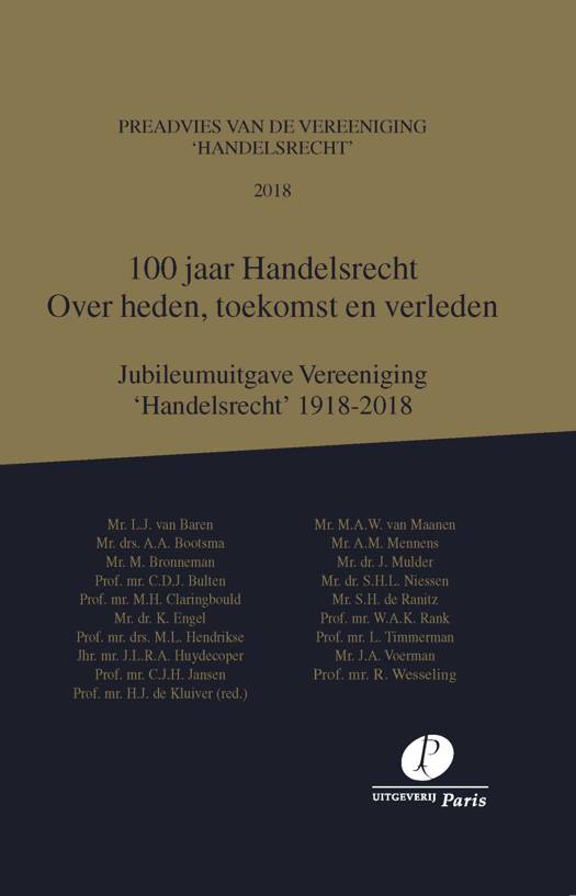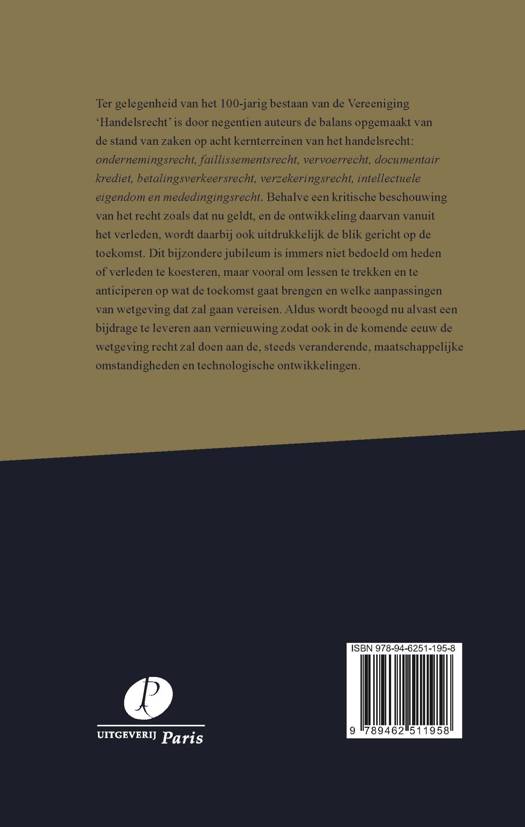 Ter gelegenheid van het 100-jarig bestaan van de Vereeniging ‘Handelsrecht’ is door negentien auteurs de balans opgemaakt van de stand van zaken op acht kernterreinen van het handelsrecht: ondernemingsrecht, faillissementsrecht, vervoerrecht, documentair krediet, betalingsverkeersrecht, verzekeringsrecht, intellectuele eigendom en mededingingsrecht. Behalve een kritische beschouwing van het recht zoals dat nu geldt, en de ontwikkeling daarvan vanuit het verleden, wordt daarbij ook uitdrukkelijk de blik gericht op de toekomst. Dit bijzondere jubileum is immers niet bedoeld om heden of verleden te koesteren, maar vooral om lessen te trekken en te anticiperen op wat de toekomst gaat brengen en welke aanpassingen van wetgeving dat zal gaan vereisen. Aldus wordt beoogd nu alvast een bijdrage te leveren aan vernieuwing zodat ook in de komende eeuw de wetgeving recht zal doen aan de, steeds veranderende, maatschappelijke omstandigheden en technologische ontwikkelingen.