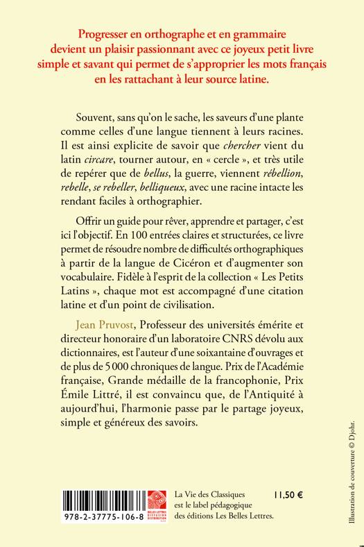 Offrir un guide pour rêver, apprendre et partager, c’est ici l’objectif. En 100 entrées claires et structurées, ce livre permet de résoudre nombre de difficultés orthographiques à partir de la langue de Cicéron et d’augmenter son vocabulaire. Fidèle à l’esprit de la collection « Les Petits Latins », chaque mot est accompagné d’une citation latine et d’un point de civilisation.