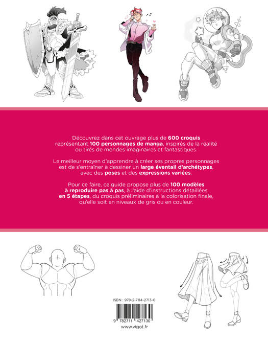 Découvrez dans cet ouvrage plus de 600 croquis représentant 100 personnages de manga, inspirés de la réalité ou tirés de mondes imaginaires et fantastiques. Le meilleur moyen d’apprendre à créer ses propres personnages est de s’entraîner à dessiner un large éventail d’archétypes, avec des poses et des expressions variées. Pour ce faire, ce guide propose plus de 100 modèles à reproduire pas à pas, à l’aide d’instructions détaillées en 5 étapes, du croquis préliminaires à la colorisation finale, qu’elle soit en niveaux de gris ou en couleur.