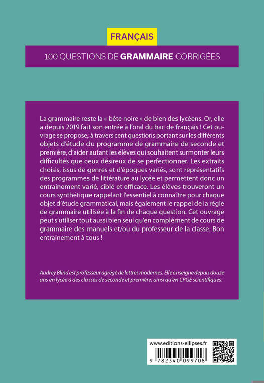 La grammaire reste la « bête noire » de bien des lycéens, or elle a depuis 2019 fait son entrée à l’oral du bac français ! Cet ouvrage se propose, à travers cent questions portant sur les différents objets d’étude du programme de grammaire de seconde et première, d’aider autant les élèves qui souhaitent surmonter leurs difficultés que ceux désireux de se perfectionner. Les extraits choisis, issus de genres et d’époques variés, sont représentatifs des programmes de littérature au lycée et permettent donc un entrainement varié, ciblé et efficace. Les élèves trouveront un cours synthétique rappelant l’essentiel à connaître pour chaque objet d’étude grammatical, mais également le rappel de la règle de grammaire utilisée à la fin de chaque question. Cet ouvrage peut s’utiliser tout aussi bien seul qu’en complément de cours de grammaire des manuels et/ou du professeur de la classe. Bon entrainement à tous !