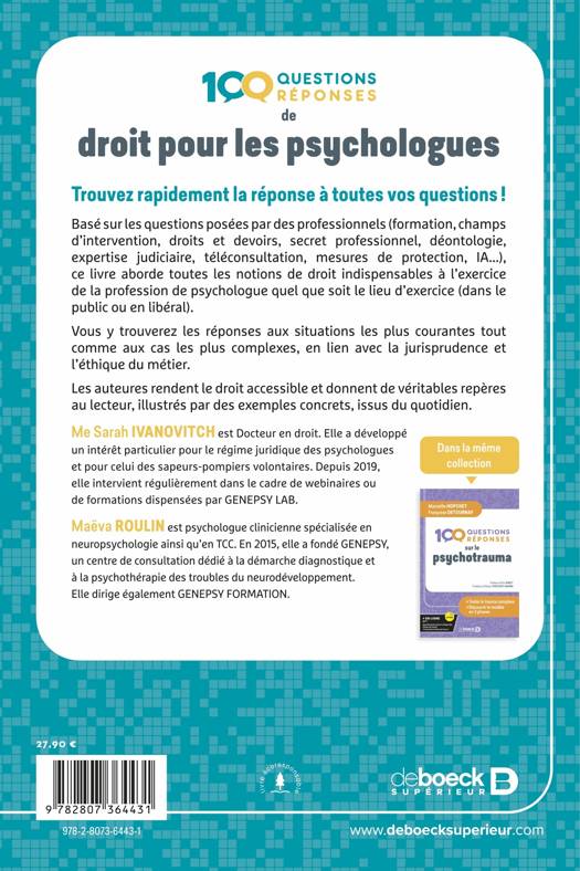 Basé sur les questions posées par des professionnels (formation, champs d’intervention, droits et devoirs, secret professionnel, déontologie, expertise judiciaire, téléconsultation, mesures de protection, IA...), ce livre aborde toutes les notions de droit indispensables à l’exercice de la profession de psychologue quel que soit le lieu d’exercice (dans le public ou en libéral).