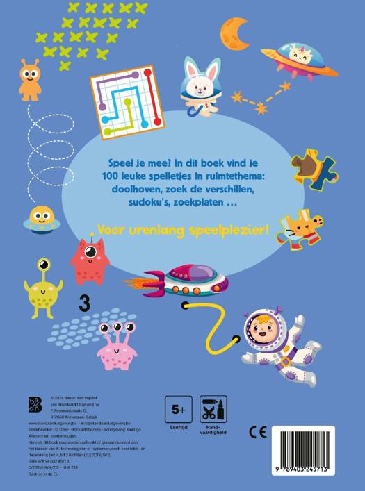 Speel je mee? In dit boek vind je 100 leuke spelletjes in ruimtethema: doolhoven, zoek de verschillen, sudoku’s, zoekplaten … Voor urenlang buitenaards speelplezier!