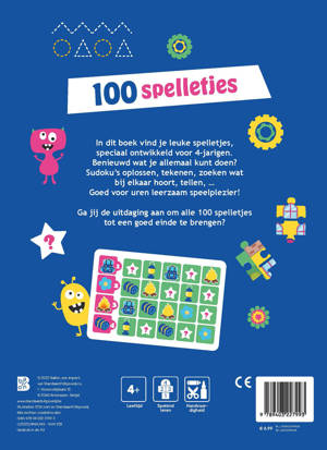 In dit boek vind je leuke spelletjes, speciaal ontwikkeld voor 4-jarigen. Benieuwd wat je allemaal kunt doen? Sudoku’s oplossen, tekenen, zoeken wat bij elkaar hoort, tellen, … Goed voor uren leerzaam speelplezier! Ga jij de uitdaging aan om alle 100 spelletjes tot een goed einde te brengen?