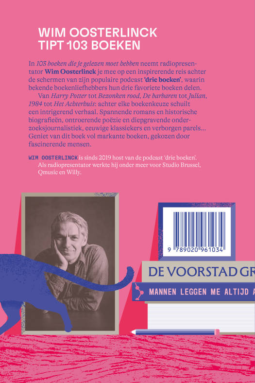In 103 boeken die je gelezen moet hebben neemt radiopresentator Wim Oosterlinck je mee op een inspirerende reis achter de schermen van zijn populaire podcast 'drie boeken' waarin bekende boekenliefhebbers hun drie favoriete boeken delen. Van Harry Potter tot Bezonken rood, De barbaren tot Julian, 1984 tot Het Achterhuis: achter elke boekenkeuze schuilt een intrigerend verhaal. Spannende romans en historische biografieën, ontroerende poëzie en diepgravende onderzoeksjournalistiek, eeuwige klassiekers en verborgen parels... Geniet van dit boek vol markante boeken, gekozen door fascinerende mensen.