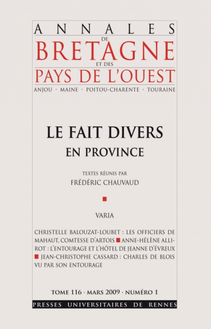 Sommaire : Table générale tome 115 – année 2008 / Coline Le Mat, Charles Frostin, Les révoltes blanches à Saint-Domingue aux xviie et xviiie siè / Jean-Christophe Cassard, Les coulisses de la sainteté ? / Frédéric Chauvaud, Le triple assassinat de la rue Montaigne : le sacre du fait divers / Armelle Le Huërou, Hervé Martin, Pérégrin d’Opole. Un prédicateur dominicain à l’apogée de la chrétienté médiévale / Frédéric Chauvaud, Le fait divers en province / Tiphaine Deschamps, Jane Cartwright, Feminine Sanctity and Spirituality in Medieval Wales / Cyril Coubard, Jean Claude Catherine (dir.), La Captivité des prisonniers de guerre : Histoire, art et mémoire (1939-1945) / Aurore Théault, Jean Martin, Yvon Pellerin, Du lin à la toile, la proto-industrie textile en Bretagne / Audrey Beaudouin, Fabrice Mauclair, La Justice au village. Justice seigneuriale et société rurale dans le duché-pairie de La Vallière (1667-1790) / Anne-Hélène Allirot, L’entourage et l’Hôtel de Jeanne d’Évreux, reine de France (1324-1371) / Christelle Balouzat-Loubet, Bien s’entourer pour mieux gouverner / Cyril Coubard, Frédérique Pitou, Jacqueline Sainclivier (dir.), Les affrontements : Usages, discours et rituels / Pascale Quincy-Lefebvre, Patrick Bourgalais, Les miroirs du silence. L’éducation des jeunes sourds dans l’Ouest 1800-1934 / Floriane Gillette, Vincent Porhel, Ouvriers bretons. Conflits d’usines, conflits identitaires en Bretagne dans les années 1968 / Laurent Jalabert, Christian Bougeard (dir.), Un siècle de socialismes en Bretagne, de la SFIO au PS (1905-2005) / Jessica Glatigny, « Une anticipation de l’inéluctable, un raccourci définitif1 » / Geoffrey Fleuriaud, Du maraudeur à l’espion international / Vincent Olivier, « Un sang-froid et un courage au-dessus de leur âge » / Anne Durepaire, Les drames conjugaux à la fin du XIXe siècle dans la « Chronique » de La Gazette des tribunaux / Jean-François Tanguy, Un crime passionnel dans la bourgeoisie provinciale à la Belle Époque : l’affaire Berthe Leclair / Céline Bertrand, L’affaire des Chartrons : une « semi-empoisonneuse » bordelaise à la Belle Époque / Michelle Le Strat, Les voleuses dans la rubrique des faits divers de la seconde moitié du xxesiècle / Guillaume Garnier, Le corps endormi au cœur du fait divers dans le monde rural du premier xixe siècle