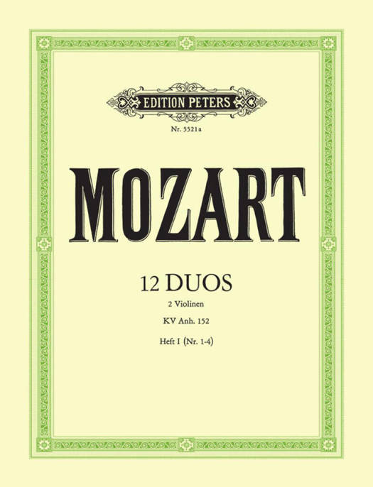 12 duos for two violins, KV Anh. 152, Volume 1 (No. 1-4). These 12 pieces are transcriptions for violin duet of works by Wolfgang Amadeus Mozart, originally published by Johann Andre in 1800 in Offenbach. This revised edition includes fingerings, bowings and suggestions for ornamentation, edited by A. Schulz.