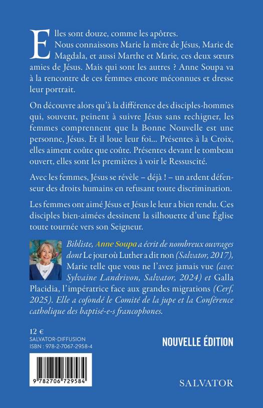 Elles sont douze, comme les apôtres. Nous connaissons Marie la mère de Jésus, Marie de Magdala, et aussi Marthe et Marie, ces deux sÅurs amies de Jésus. Mais qui sont les autres ? Anne Soupa va à la rencontre de ces femmes encore méconnues et dresse leur portrait. On découvre alors qu'à la différence des disciples-hommes qui, souvent, peinent à suivre Jésus sans rechigner, les femmes comprennent que la Bonne Nouvelle est une personne, Jésus. Et il loue leur foi... Présentes à la Croix, elles aiment coûte que coûte. Présentes devant le tombeau ouvert, elles sont les premières à voir le Ressuscité. Avec les femmes, Jésus se révèle – déjà ! – un ardent défenseur des droits humains en refusant toute discrimination. Les femmes ont aimé Jésus et Jésus le leur a bien rendu. Ces disciples bien-aimées dessinent la silhouette d'une Église toute tournée vers son Seigneur. Bibliste, Anne Soupa a écrit de nombreux ouvrages dont Le jour où Luther a dit non (Salvator, 2017).