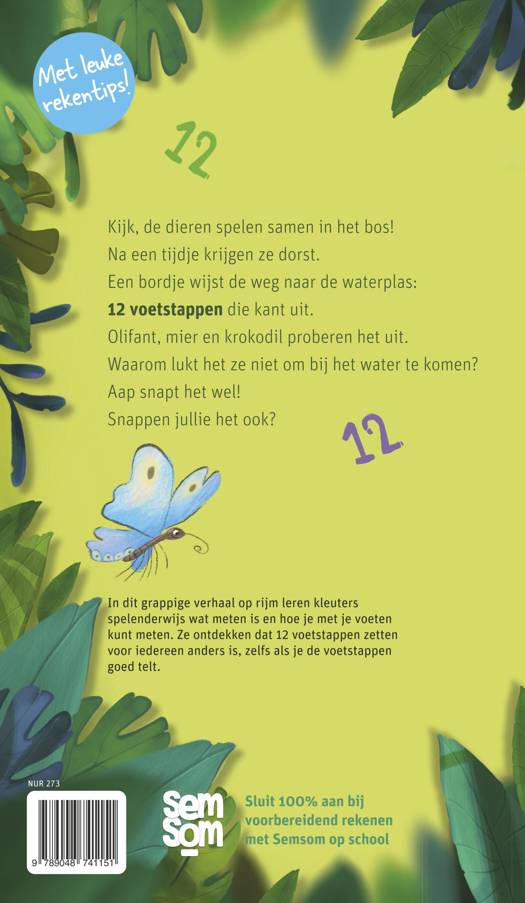 Uniek rekenprentenboek van Job van Gelder waarin kleuters spelenderwijs leren wat meten is. Hoe ver is het tot de waterplas? Olifant weet het wel. 12 stappen, want dat staat op het bordje. Huh? Olifant komt veel verder uit. In dit grappige verhaal op rijm kijken en tellen kleuters goed en ontdekken zo dat 12 voetstappen zetten voor iedereen anders is. Van de makers van Semsom, van school. Leuk én uitdagend voor iedere kleuter!