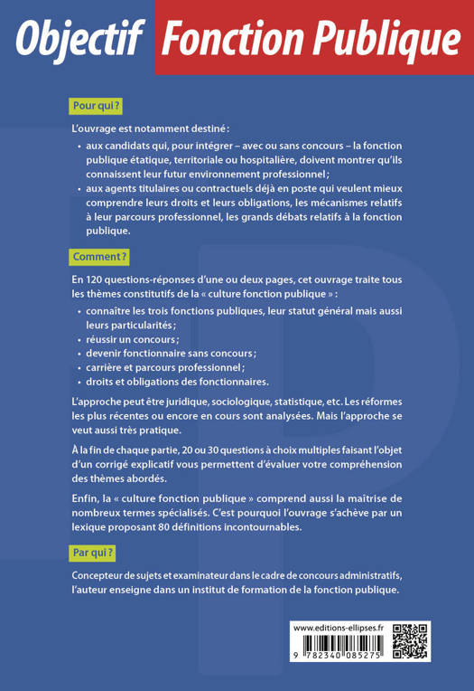 L’ouvrage est notamment destiné aux candidats qui souhaitent intégrer la fonction publique étatique, territoriale ou hospitalière. Il peut également intéresser les agents titulaires ou contractuels déjà en poste qui veulent mieux comprendre leurs droits et leurs obligations, les mécanismes relatifs à leur parcours professionnel, les grands débats relatifs à la fonction publique.