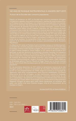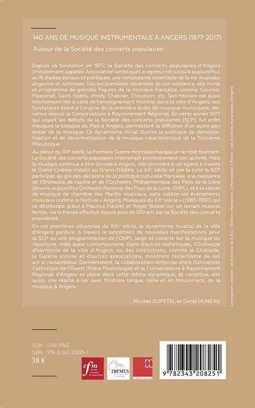 Depuis sa fondation en 1877, la Société des concerts populaires d'Angers (initialement appelée Association artistique) a représenté jusqu'à aujourd'hui, au fil d'aléas sociaux et politiques, une composante essentielle de la vie musicale, angevine et nationale. Dès les premières décennies de son existence, elle invita et programma de grandes Figures de la musique française, comme Gounod, Massenet, Saint-Saëns, d'Indy, Chabrier, Chausson. Son histoire est aussi intimement liée à celle de l'enseignement musical dans la ville d'Angers, ses fondateurs étant à l'origine de la première école de musique municipale, devenue depuis le Conservatoire à Rayonnement Régional. Cet ouvrage constitue les actes d'un colloque tenu à l'Université Catholique de l'Ouest en 2017.