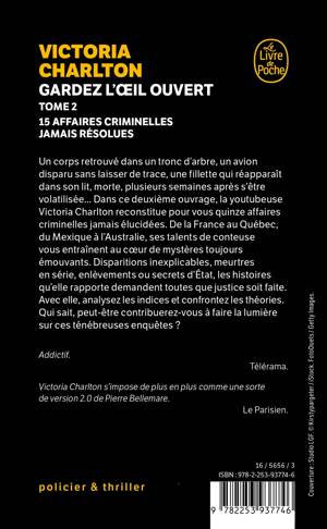 Un corps retrouvé dans un arbre, un avion disparu sans laisser de trace, une fillette qui réapparaît dans son lit plusieurs semaines après s’être volatilisée... Dans ce deuxième ouvrage, la youtubeuse Victoria Charlton reconstitue pour vous quinze affaires criminelles jamais élucidées. De la France au Québec, du Mexique à l’Australie, ses talents de conteuse vous entraînent au cœur de mystères toujours émouvants. Disparitions inexplicables, meurtres en série, enlèvements ou secrets d’État, les histoires qu’elle rapporte demandent toutes que justice soit faite. Avec elle, analysez les indices et confrontez les théories. Qui sait, peut-être contribuerez-vous à faire la lumière sur ces ténébreuses affaires ?