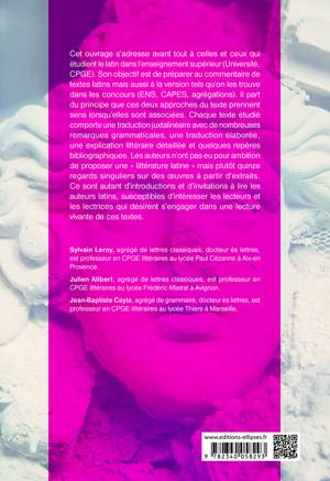 Cet ouvrage s'adresse avant tout à celles et ceux qui étudient le latin dans l'enseignement supérieur (Université, CPGE). Son objectif est de préparer au commentaire de textes latins mais aussi à la version tels qu'on les trouve dans les concours (ENS, CAPES, agrégations). Il part du principe que ces deux approches du texte prennent sens lorsqu’elles sont associées. Chaque texte étudié comporte une traduction juxtalinéaire avec de nombreuses remarques grammaticales, une traduction élaborée, une explication littéraire détaillée et quelques repères bibliographiques. Les auteurs n'ont pas eu pour ambition de proposer une « littérature latine » mais plutôt quinze regards singuliers sur des œuvres à partir d’extraits. Ce sont autant d’introductions et d'invitations à lire les auteurs latins, susceptibles d’intéresser les lecteurs et les lectrices qui désirent s’engager dans une lecture vivante de ces textes.