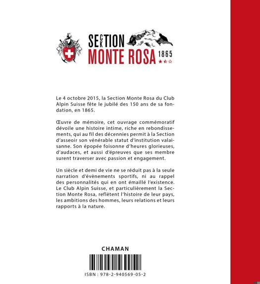 Le 4 octobre 2015, la Section Monte Rosa du Club Alpin Suisse fêtait le jubilé des 150 ans de sa fondation, en 1865. Œuvre de mémoire, cet ouvrage commémoratif dévoile une histoire intime, riche en rebondissements, qui au fil des décennies permit à la Section d'asseoir son vénérable statut d'institution valaisanne. Son épopée foisonne d'heures glorieuses, d'audaces, et aussi d'épreuves que ses membres surent traverser avec passion et engagement. Un siècle et demi de vie ne se réduit pas à la seule narration d'événements sportifs, ni au rappel des personnalités qui en ont émaillé l'existence. Le Club Alpin Suisse, et particulièrement la Section Monte Rosa, reflètent l'histoire de leur pays, les ambitions des hommes et leur relation à la nature.