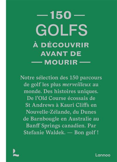 Après 150 bars, 150 restaurants, voici 150 golfs à découvrir avant de mourir. Pour les amoureux de ce sport, ces parcours sont des sites incontournables. L’autrice new-yorkaise a sélectionné les 150 meilleurs parcours du monde, en y joignant de nombreuses illustrations et des informations pratiques. Ces terrains sont situés le long des côtes, au cœur des montagnes, dans des déserts, au bord de lacs ou en lisière de forêts, partout dans le monde. Et tout le monde peut s’y essayer puisque ces parcours sont ouverts au public.