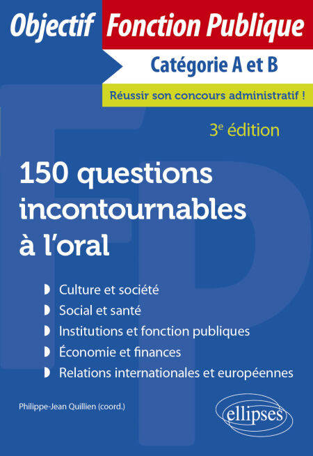 Culture et société, Social et santé, Institutions et fonction publiques, Économie et finances, Relations internationales et européennes.Ces 150 questions sont choisies parmi celles qui sont le plus souvent posées par les jurys des concours étatiques, territoriaux ou hospitaliers de catégorie A ou B.