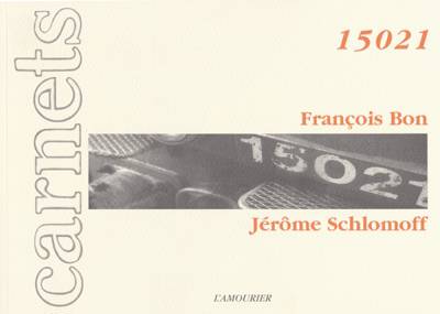 Naît de l'expérience un récit, "Paysage fer" éditions Verdier, une autre collaboration : l'écrivain lit à haute voix, le photographe projette des diapositives, et maintenant ce livre, "15021", qui présente trente-cinq des photographies prises du train par Jérôme Schlomoff. Cette fois, ce n'est plus le réel que le texte en vis-à-vis interroge, mais les photographies elles-mêmes, ce qu'elles induisent d'un décalage de ce réel, et le geste même du photographe.