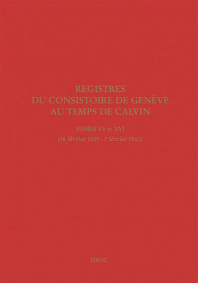 Publiés en un seul volume, les tomes XV et XVI des Registres du Consistoire de Genève couvrent l’année 1559 et le début de 1560. Une maladie grave empêche Calvin d’assister aux séances pendant plus de trois mois en hiver et au printemps, mais le Consistoire continue à imposer sa discipline même en l’absence du réformateur. En 1559, la création du Collège, destiné à l’éducation de la jeunesse genevoise, coïncide avec l’importance croissante que le Consistoire accorde à la pédagogie, comme en témoignent les nombreuses actions contre l’absentéisme au catéchisme, impliquant principalement des jeunes hommes. Si quelques Italiens sont attirés par les idées de Michel Servet contre le dogme de la Trinité, de nombreux Genevois embrassent la foi réformée avec enthousiasme comme le montre l’interdiction de réserver des places pour d’autres personnes dans les temples bondés de la ville. Parmi les actions qui concernent le contrôle du mariage, on peut signaler la validation du mariage d’un évêque français et de sa concubine et le divorce accordé au marquis Galéas Caracciolo, petit-neveu du pape Paul IV, en raison de désertion, parce que son épouse catholique refusait de quitter l’Italie et de le suivre à Genève.