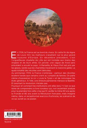 Au printemps 1709, la France s'embrase : partout des révoltes éclatent tandis que certains crient au complot de famine. On parle même d'assassiner le roi « Louis le Tyran » et de convoquer les états généraux. À l'été, une émeute parisienne menace la Bastille. Et pourtant la révolution n’éclate pas.