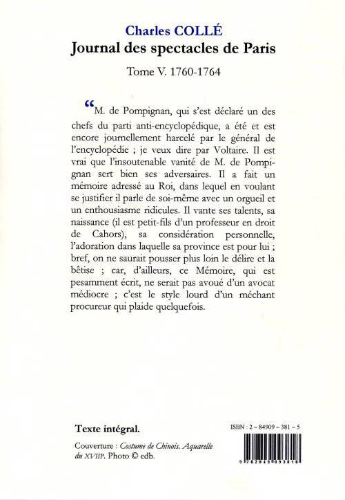 « M. de Pompignan, qui s'est déclaré un des chefs du parti anti-encyclopédique, a été et est encore journellement harcelé par le général de l'encyclopédie ; je veux dire par Voltaire. Il est vrai que l'insoutenable vanité de M. de Pompignan sert bien ses adversaires. Il a fait un mémoire adressé au Roi, dans lequel en voulant se justifier il parle de soi-même avec un orgueil et un enthousiasme ridicules. Il vante ses talents, sa naissance (il est petit-fils d'un professeur en droit de Cahors), sa considération personnelle, l'adoration dans laquelle sa province est pour lui ; bref, on ne saurait pousser plus loin le délire et la bêtise ; car, d'ailleurs, ce Mémoire, qui est pesamment écrit, ne serait pas avoué d'un avocat médiocre ; c'est le style lourd d'un méchant procureur qui plaide quelquefois.