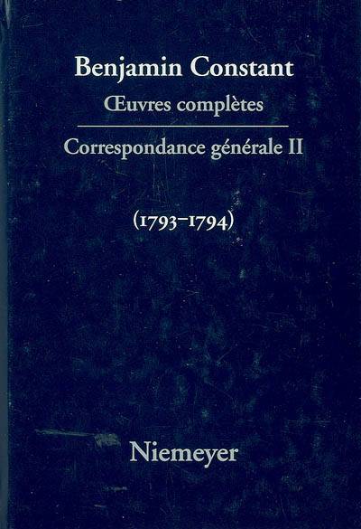 Ce deuxième tome de la Correspondance générale, qui couvre les années 1793 et 1794, se compose en grande partie de la suite de la brillante série de lettres que Benjamin Constant (1767-1830), courtisan à Brunswick, avait commencée à échanger avec Isabelle de Charrière en Suisse en 1787. Ces lettres, ainsi que celles qu'il adresse à d'autres correspondants (notamment à plusieurs membres de sa famille et à des amis brundwickois) nous permettent de suivre toutes les péripéties de sa vie intellectuelle et sentimentale de cette époque, y compris son amitié avec le publiciste Jakob Mauvillon, son rôle dans les procès militaires de son père, son divorce avec sa première femme Minna von Cramm, son amitié amoureuse avec Charlotte von Hardenberg (qui deviendra sa deuxième femme), sa rupture avec la Cour de Brunswick, son retour en Suisse et le commencement de sa longue liaison avec Germaine de Staël.