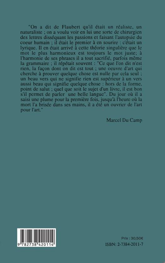 "On a dit de Flaubert qu'il était un réaliste, un naturaliste ; on a voulu voir en lui une sorte de chirurgien des lettres disséquant les passions et faisant l'autopsie du coeur humain ; il était le premier à en sourire : c'était un lyrique. Il en était arrivé à cette théorie singulière que le mot le plus harmonieux est toujours le mot juste ; à l'harmonie de ses phrases il a tout sacrifié, parfois même la grammaire ; il répétait souvent : "Ce que l'on dit n'est rien, la façon dont on dit est tout ; une oeuvre d'art qui cherche à prouver quelque chose est nulle par cela seul ; un beau vers qui ne signifie rien est supérieur à un vers aussi beau qui signifie quelque chose ; hors de la forme, point de salut ; quel que soit le sujet d'un livre, il est bon s'il permet de parler une belle langue". Du jour où il a saisi une plume pour la première fois, jusqu'à l'heure où la mort l'a brisée dans ses mains, il a été un ouvrier de l'art pour l'art."