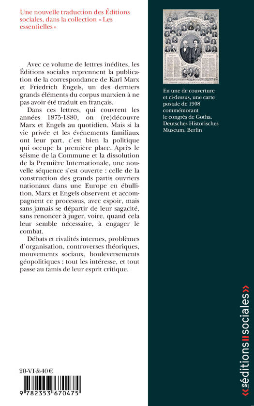 Avec ce volume de lettres inédites, les Éditions sociales reprennent la publication de la correspondance de Marx et Engels, un des derniers grands éléments du corpus marxien à ne pas avoir été traduit en français.Dans ces lettres, qui couvrent les années 1875-1880, on (re)découvre Marx et Engels au quotidien. Mais si la vie privée et les événements familiaux ont leur part, c'est bien la politique qui occupe la première place. Après le séisme de la Commune et la dissolution de la Première Internationale, une nouvelle séquence s'est ouverte : celle de la construction des grands partis ouvriers nationaux dans une Europe en ébullition. Marx et Engels observent et accompagnent ce processus, avec espoir, mais sans jamais se départir de leur sagacité, sans renoncer à juger, voire, quand cela leur semble nécessaire, à engager le combat.Débats et rivalités internes, problèmes d'organisation, controverses théoriques, mouvements sociaux, bouleversements géopolitiques : tout les intéresse.