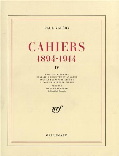 À la fin de l'année 1900, les Cahiers changent durablement d'aspect. Une écriture disciplinée s'installe dans l'espace stable de grands registres cartonnés, révélant le souci d'un travail régulier maintenant devenu rituel. Le quatrième volume de l'édition intégrale, établie d'après les manuscrits originaux conservés à la Bibliothèque nationale, contient les trois premiers cahiers d'une longue série chronologique, commencés respectivement en novembre 1900, juillet 1901 et novembre 1901. Valéry a trouvé sa devise, que rien désormais ne démentira : "J'ai l'esprit unitaire, en mille morceaux." Elle dit la volonté de ne jamais donner prise, le principe de rupture qui préside au choix de la forme fragmentée. Sous l'hétérogénéité apparente de notes très diverses, le texte a pourtant sa continuité souterraine. Le but principal se dit, comme naguère, représenter la connaissance et tenter d'en définir le fonctionnement. Valéry reprend un très ancien problème : le rapport de l'image sensible et de l'intelligible, de la sensation et du concept. La recherche est sous-tendue par une lecture critique, avouée ou tacite, des philosophes : Aristote, Thomas d'Aquin, Descartes et surtout Kant suscitent le désir de repenser les concepts fondamentaux de la culture occidentale. Mais une autre tension anime ces cahiers : celui qui se plaçait sous le signe de la mystique de l'intellect se confronte à l'étrangeté corporelle. Comment l'esprit peut-il s'accommoder du corps, cet incompréhensible véhicule du Moi, avec son langage obscur et les mystères de ses organes ? L'importance maintenant accordée à la condition incarnée freine l'élan d'une ascèse qui rêva de conduire l'esprit là où il coïnciderait avec les structures a priori de la conscience : à la Limite.