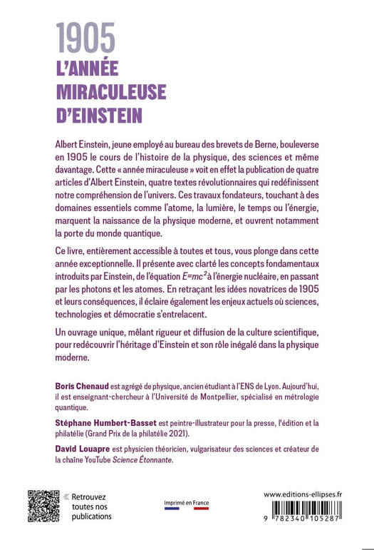 Ce livre plonge dans l'année 1905 et les grandes avancées physiques qu'elle a permises. Il présente avec clarté les concepts fondamentaux introduits par Einstein, de la relativité à l’énergie nucléaire, en passant par les photons et les atomes. Il contient également plusieurs illustrations.