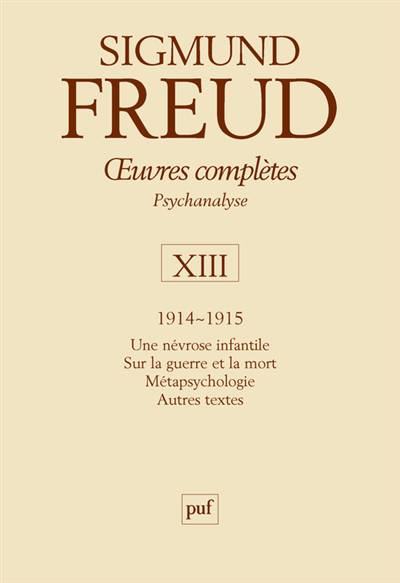 Ce volume XIII des OCF.P présente, parmi tous les textes publiés durant cette période, les textes Une névrose infantile, Sur la guerre et la mort, Métapsychologie.