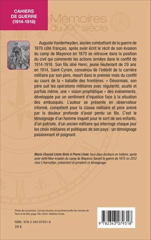 Auguste Vonderheyden, ancien combattant de la guerre de 1870 côté français, se retrouve en 1914 dans la position du vétéran qui commente le conflit. Son fils aîné, Henri, jeune lieutenant de 29 ans, Saint-Cyrien, meurt lors du premier mois de la guerre. Malgré le drame son père suivra les opérations militaires avec régularité, acuité et parfois même une « vision prophétique » des événements. À travers ses écrits personnels l'auteur se révèle un observateur informé et un père animé par la douleur profonde d'avoir perdu un fils. Un témoignage passionnant et poignant.