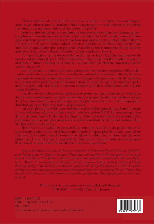 L'ambition de cet ouvrage est de construire, à l'échelon d'un département, une histoire quantitative fine qui permette de révéler le fonctionnement des institutions militaires et de suivre le destin des individus qui vont laisser leur vie. Ce type d'analyse est rendu possible par la mise en ligne des fiches nominatives de tous les soldats décédés durant le premier conflit mondial, et qui ont obtenu la mention "Mort pour la France". L'analyse de ces fiches permet également de porter un regard neuf sur les conditions du décès des combattants et sur l'importance du tribut payé par chaque région ou département.