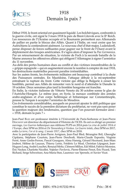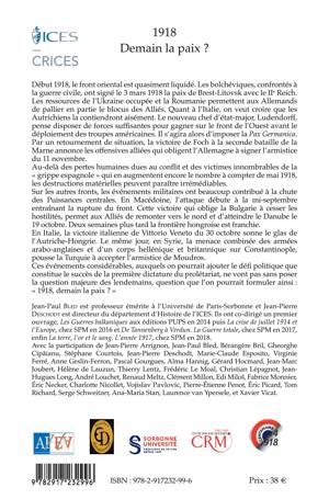 Début 1918, le front oriental est quasiment liquidé. Le Traité de Brest-Litovsk est signé en mars. Ludendorff pense disposer de forces suffisantes pour gagner sur le front de l’ouest et imposer la Pax Germanica. Mais les dernières offensives de l’armée allemande sont infructueuses et l’armistice est signé le 11 novembre. Au-delà des pertes humaines dues au conflit et des victimes innombrables de la « grippe espagnole », les destructions matérielles peuvent paraître irrémédiables. Sur les autres théâtres d’opération, les épisodes militaires ont beaucoup contribué à la chute des Puissances centrales. Ces événements considérables, auxquels on pourrait ajouter le défi politique que constitue le succès de la première révolution prolétarienne, ne vont pas sans poser évidemment la question majeure des lendemains, question que l’on pourrait formuler ainsi : « 1918, demain la paix ? »