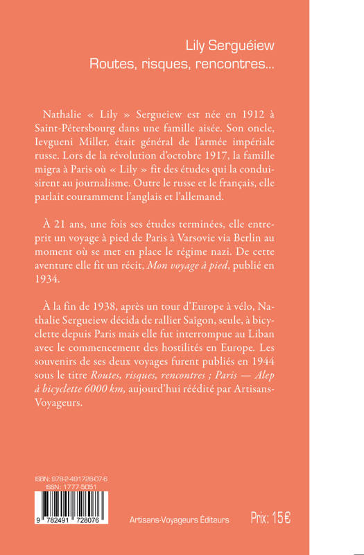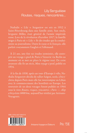 Nathalie « Lily » Sergueiew est née en 1912 à Saint-Pétersbourg dans une famille aisée. Son oncle, Ievgueni Miller, était général de l’armée impériale russe. Lors de la révolution d’octobre 1917, la famille migra à Paris où « Lily » fit des études qui la conduisirent au journalisme. Outre le russe et le français, elle parlait couramment l’anglais et l’allemand. À 21 ans, une fois ses études terminées, elle entreprit un voyage à pied de Paris à Varsovie via Berlin au moment où se met en place le régime nazi. De cette aventure elle fit un récit, Mon voyage à pied, publié en 1934. À la fin de 1938, après un tour d’Europe à vélo, Nathalie Sergueiew décida de rallier Saîgon, seule, à bicyclette depuis Paris mais elle fut interrompue au Liban avec le commencement des hostilités en Europe. Les souvenirs de ses deux voyages furent publiés en 1944 sous le titre Routes, risques, rencontres ; Paris — Alep à bicyclette 6000 km, aujourd’hui réédité par Artisans-Voyageurs.