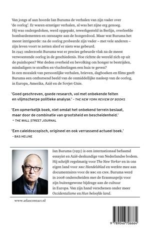 Van jongs af aan hoorde Ian Buruma de verhalen van zijn vader over `de oorlog . Er waren ernstiger verhalen, al was het zijne erg genoeg. Hij was ondergedoken, werd opgepakt, te werk gesteld in Berlijn, overleefde bombardementen en ontsnapte aan de hongerdood. Maar wat Buruma het meest intrigeerde: na de oorlog probeerde zijn vader met vele anderen zijn leven voort te zetten alsof er niets was gebeurd. In 1945 onderzoekt Buruma wat er precies gebeurde vlak na de meest verwoestende oorlog in de geschiedenis. Hoe richtte de wereld zich op uit de puinhopen? Wat deden overheid en bevolking om honger te bestrijden, misdadigers te straffen en vluchtelingen een huis te geven? In een mozaïek van persoonlijke verhalen, brieven, dagboeken en films geeft Buruma een onthutsend beeld van de onmiddellijke nasleep van de oorlog, in Europa, Amerika, Azië en de Sovjet-Unie.