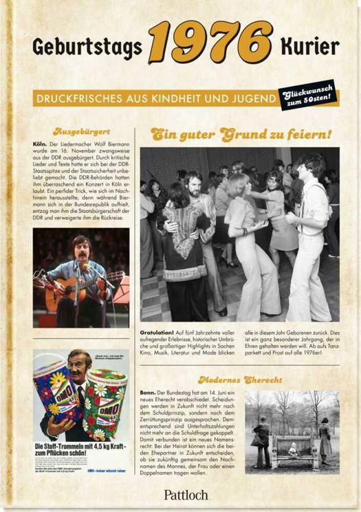In diesem ganz besonderen Geschenkbuch in Form einer Geburtstagszeitung zum 50. Geburtstag finden sich interessante Infos zum damaligen Zeitgeschehen, Rezepte, längst vergessene Werbeanzeigen und spannende Rätsel.