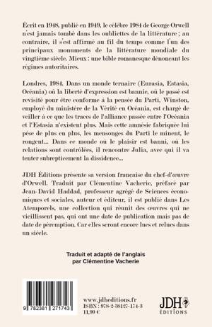 Écrit en 1948, publié en 1949, le célèbre 1984 de George Orwell n'est jamais tombé dans les oubliettes de la littérature ; au contraire, il s'est affirmé au fil du temps comme l'un des principaux monuments de la littérature mondiale du vingtième siècle. Mieux: une bible romanesque dénonçant les régimes autoritaires. Londres, 1984. Dans un monde ternaire (Eurasia, Estasia, Océania) où la liberté d'expression est bannie, où le passé est revisité pour être conforme à la pensée du Parti, Winston, employé du ministère de la Vérité en Océania, est chargé de veiller à ce que les traces de l'alliance passée entre l'Océania et l'Estasia n'existent plus. Mais cette amnésie fabriquée lui pèse de plus en plus, les mensonges du Parti le minent, le rongent... Dans ce monde où le plaisir est banni, où les relations sont contrôlées, il rencontre Julia, avec qui il va tenter subrepticement la dissidence... JDH Éditions présente sa version française du chef-d'oeuvre d'Orwell. Traduit par Clémentine Vacherie, préfacé par Jean-David Haddad, professeur agrégé de Sciences économiques et sociales, auteur et éditeur, il est publié dans Les Atemporels, une collection qui réunit des oeuvres qui ne vieillissent pas, qui ont une date de publication mais pas de date de péremption. Car elles seront encore lues et relues dans un siècle. Cette version inclut la traduction française du "Novlang" la langue imaginée par Orwell. Collection Les Atemporels.