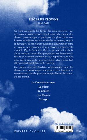 Ce livre rassemble les textes de La Curiosité des anges, Le 6e Jour,Le Concert, Les Clowns, Carnages, cinq spectacles qui ont jalonné trente années d’exploration du monde des clowns, personnages n’ayant pas de place dans une histoire et reflétant nos désirs absolus et intimes, jusqu’à la démesure. Ils témoignent aussi de la collaboration entre un auteur contemporain et des clowns exceptionnels – Arletti, Zig, le Boudu et Octo –, qui ont fait le choix d’une aventure irréversible, qui questionnent le monde du théâtre en y faisant irruption et nous rappellent que plus nous avons besoin de nous rassembler, plus il nous faut aller profondément dans notre solitude.