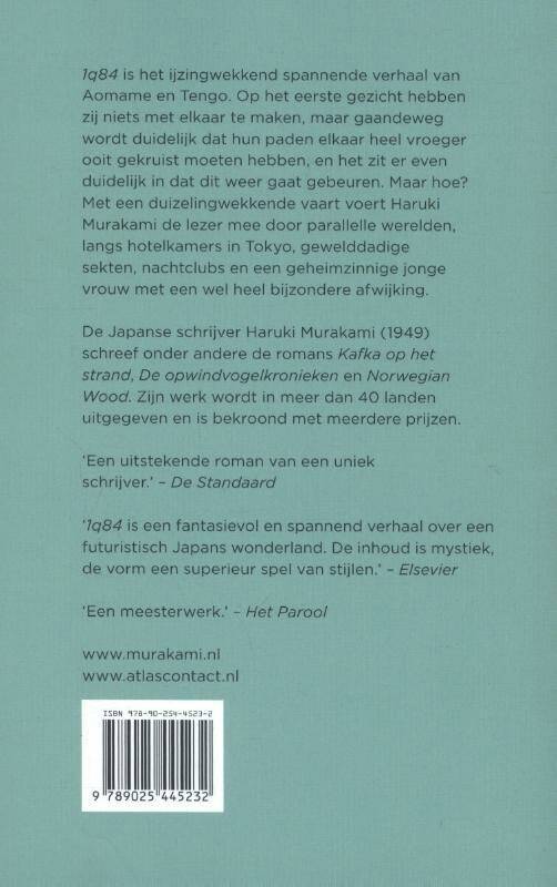 ‘1q84’ van Haruki Murakami is het ijzingwekkend spannende verhaal van Aomame en Tengo. Op het eerste gezicht hebben zij niets met elkaar te maken, maar gaandeweg wordt duidelijk dat hun paden elkaar heel vroeger ooit gekruist moeten hebben, en het zit er even duidelijk in dat dit weer gaat gebeuren. Maar hoe? Met een duizelingwekkende vaart voert Haruki Murakami de lezer mee door parallelle werelden, langs hotelkamers in Tokyo, gewelddadige sekten, nachtclubs en een geheimzinnige jonge vrouw met een wel heel bijzondere afwijking.