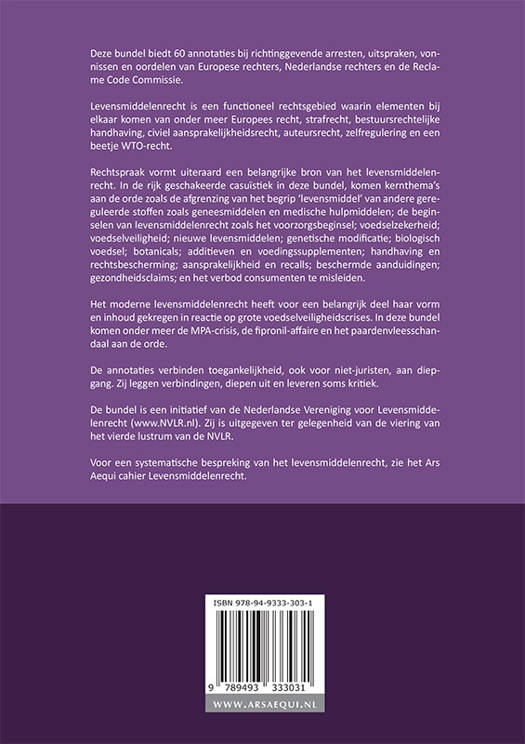 Deze bundel biedt 60 annotaties bij richtinggevende arresten, uitspraken, vonnissen en oordelen van Europese rechters, Nederlandse rechters en de Reclame Code Commissie. Levensmiddelenrecht is een functioneel rechtsgebied waarin elementen bij elkaar komen van onder meer Europees recht, strafrecht, bestuursrechtelijke handhaving, civiel aansprakelijkheidsrecht, auteursrecht, zelfregulering en een beetje WTO-recht. Rechtspraak vormt uiteraard een belangrijke bron van het levensmiddelenrecht. In de rijk geschakeerde casuïstiek in deze bundel, komen kernthema’s aan de orde zoals de afgrenzing van het begrip ‘levensmiddel’ van andere gereguleerde stoffen zoals geneesmiddelen en medische hulpmiddelen; de beginselen van levensmiddelenrecht zoals het voorzorgsbeginsel; voedselzekerheid; voedselveiligheid; nieuwe levensmiddelen; genetische modificatie; biologisch voedsel; botanicals; additieven en voedingssupplementen; handhaving en rechtsbescherming; aansprakelijkheid en recalls; beschermde aanduidingen; gezondheidsclaims; en het verbod consumenten te misleiden. Het moderne levensmiddelenrecht heeft voor een belangrijk deel haar vorm en inhoud gekregen in reactie op grote voedselveiligheidscrises. In deze bundel komen onder meer de MPA-crisis, de fipronil-affaire en het paardenvleesschandaal aan de orde. De annotaties verbinden toegankelijkheid, ook voor niet-juristen, aan diepgang. Zij leggen verbindingen, diepen uit en leveren soms kritiek. De bundel is een initiatief van de Nederlandse Vereniging voor Levensmiddelenrecht (www.NVLR.nl). Zij is uitgegeven ter gelegenheid van de viering van het vierde lustrum van de NVLR. Voor een systematische bespreking van het levensmiddelenrecht, zie het Ars Aequi cahier Levensmiddelenrecht.
